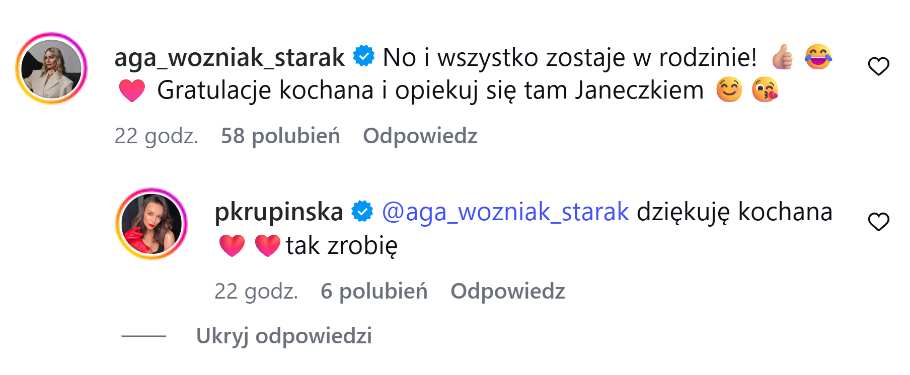 Nic więc dziwnego, że opinia Woźniak-Starak była jedną z najbardziej wyczekiwanych. Gdy tylko oficjalne ogłoszenie pojawiło się na instagramowym profilu programu, Agnieszka błyskawicznie zareagowała. Jej komentarz był zaskakująco ciepły i szczery: „No i wszystko zostaje w rodzinie! Gratulacje kochana i opiekuj się tam Janeczkiem”. Tym samym pokazała, że między nią a Krupińską nie ma żadnych napięć, a relacja pozostaje niezmiennie przyjazna.