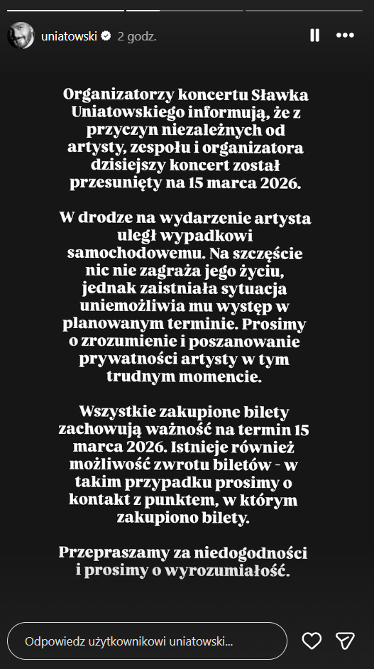 Organizatorzy koncertu Sławka Uniatowskiego informują, że z przyczyn niezależnych od artysty, zespołu i organizatora dzisiejszy koncert został przesunięty na 15 marca 2026. W drodze na wydarzenie artysta uległ wypadkowi samochodowemu. Na szczęście nic nie zagraża jego życiu, jednak zaistniała sytuacja uniemożliwia mu występ w planowanym terminie. Prosimy o zrozumienie i poszanowanie prywatności artysty w tym trudnym momencie – czytamy.