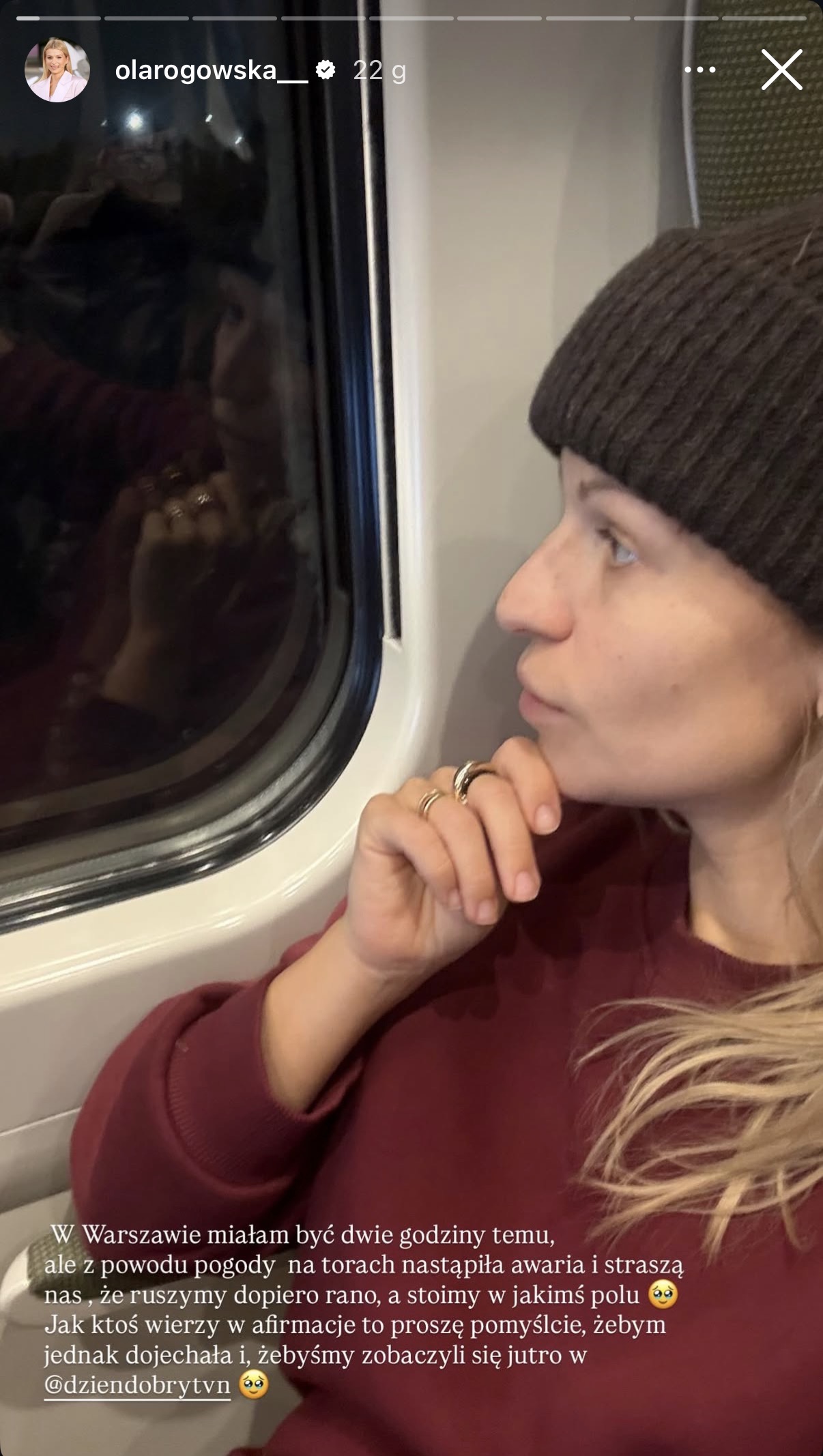 W Warszawie miałam być dwie godziny temu, ale z powodu pogody na torach nastąpiła awaria i straszą nas, że ruszymy dopiero rano, a stoimy w jakimś polu. Jak ktoś wierzy w afirmację to proszę pomyślcie, abym jednak dojechała i żebyśmy zobaczyli się jutro w “Dzień dobry TVN” – pisała.
