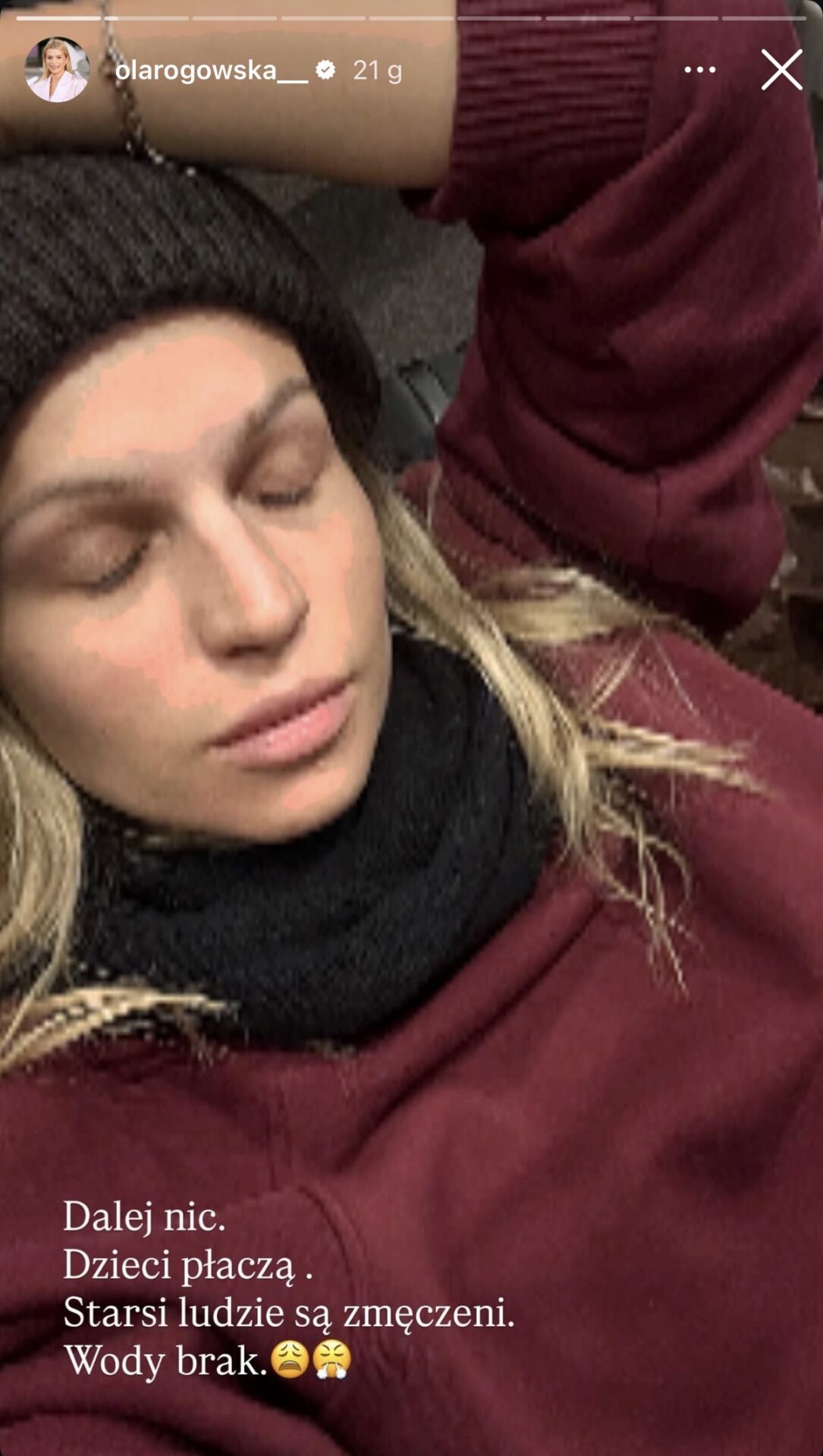 Dalej nic, dzieci płaczę, starsi ludzie są zmęczeni, wody brak – relacjonowała na InstaStories.