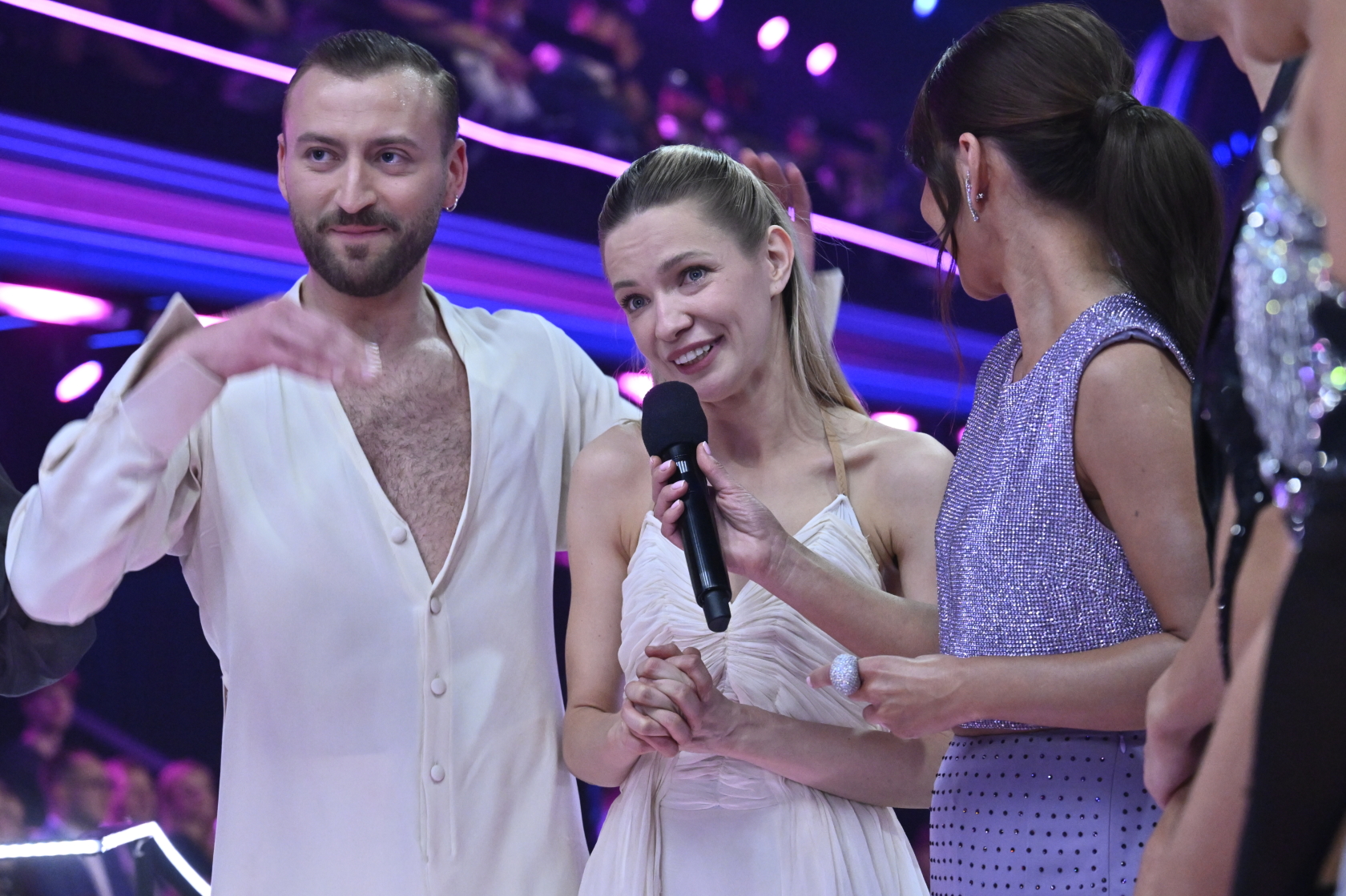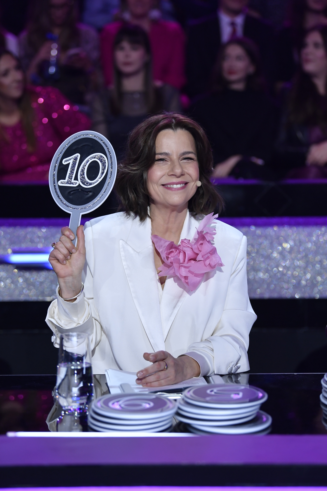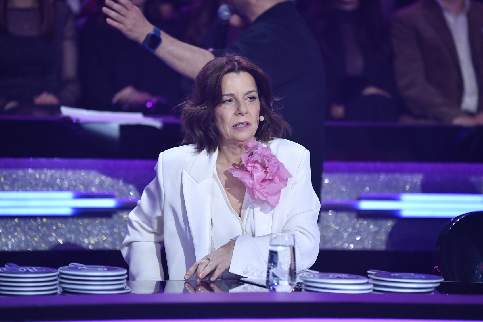 Agata Kulesza, która dziś zastępowała Ewę Kasprzyk w roli jurorki „Tańca z Gwiazdami”, zaprezentowała się w eleganckiej, jasnej stylizacji utrzymanej w odcieniach bieli i écru – miała na sobie klasyczną marynarkę o prostym kroju z lekko podwiniętymi rękawami oraz delikatną, dopasowaną bluzkę z dekoltem w serek, a całość uzupełniała efektowna, duża różowa aplikacja w kształcie kwiatu przypięta do klapy, która stanowiła główny, przyciągający wzrok akcent; styl dopełniała subtelna biżuteria w postaci bransoletki i pierścionków, naturalny makijaż oraz krótkie, lekko falowane włosy, co razem stworzyło wrażenie klasycznej elegancji z nutą świeżości i kobiecego wyrazu.