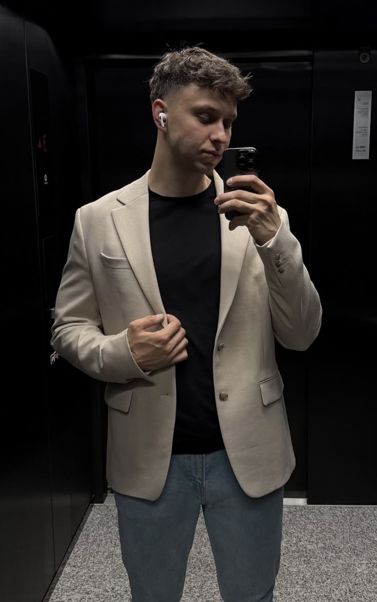 - ciemne jeansy zestawione z taliowaną marynarką,