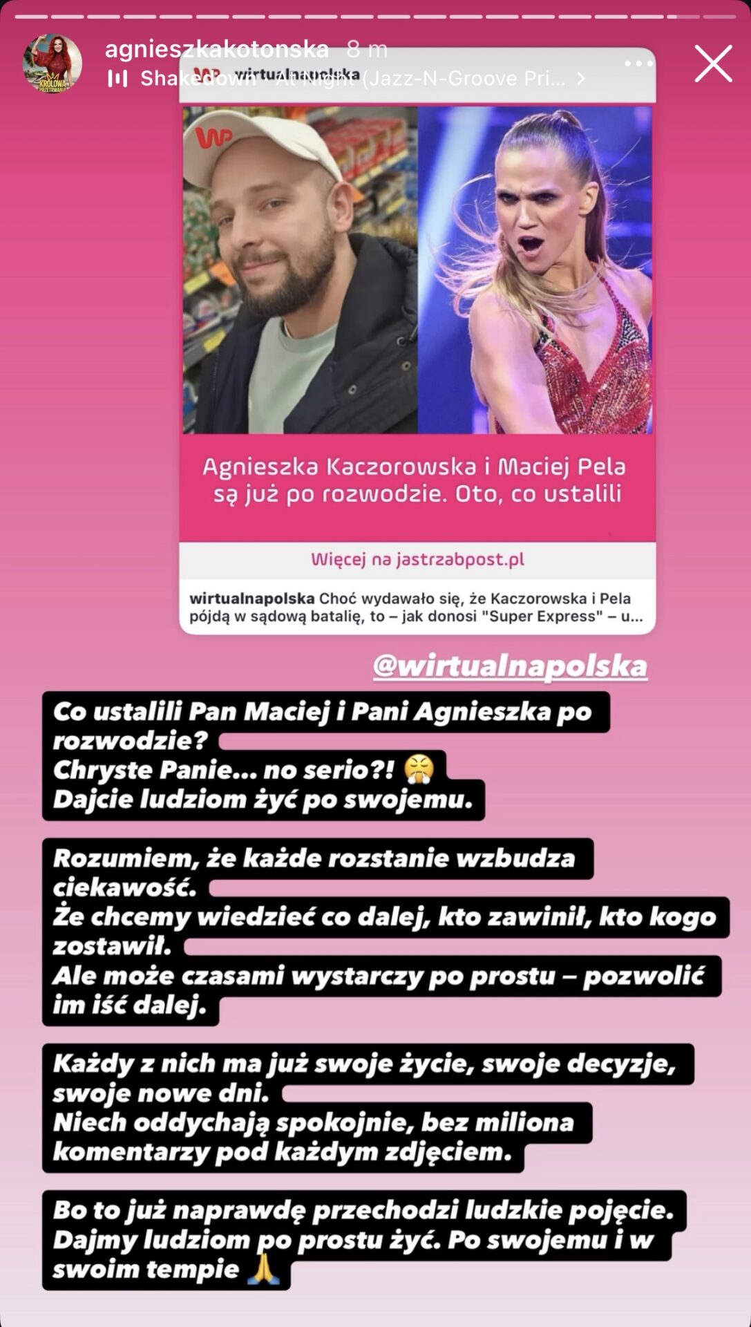 Co ustalili Pan Maciej i Pani Agnieszka po rozwodzie? Chryste Panie… no serio?! Dajcie ludziom żyć po swojemu. Rozumiem, że każde rozstanie wzbudza ciekawość. Że chcemy wiedzieć co dalej, kto zawinił, kto kogo zostawił. Ale może czasami wystarczy po prostu – pozwolić im iść dalej – czytamy.
