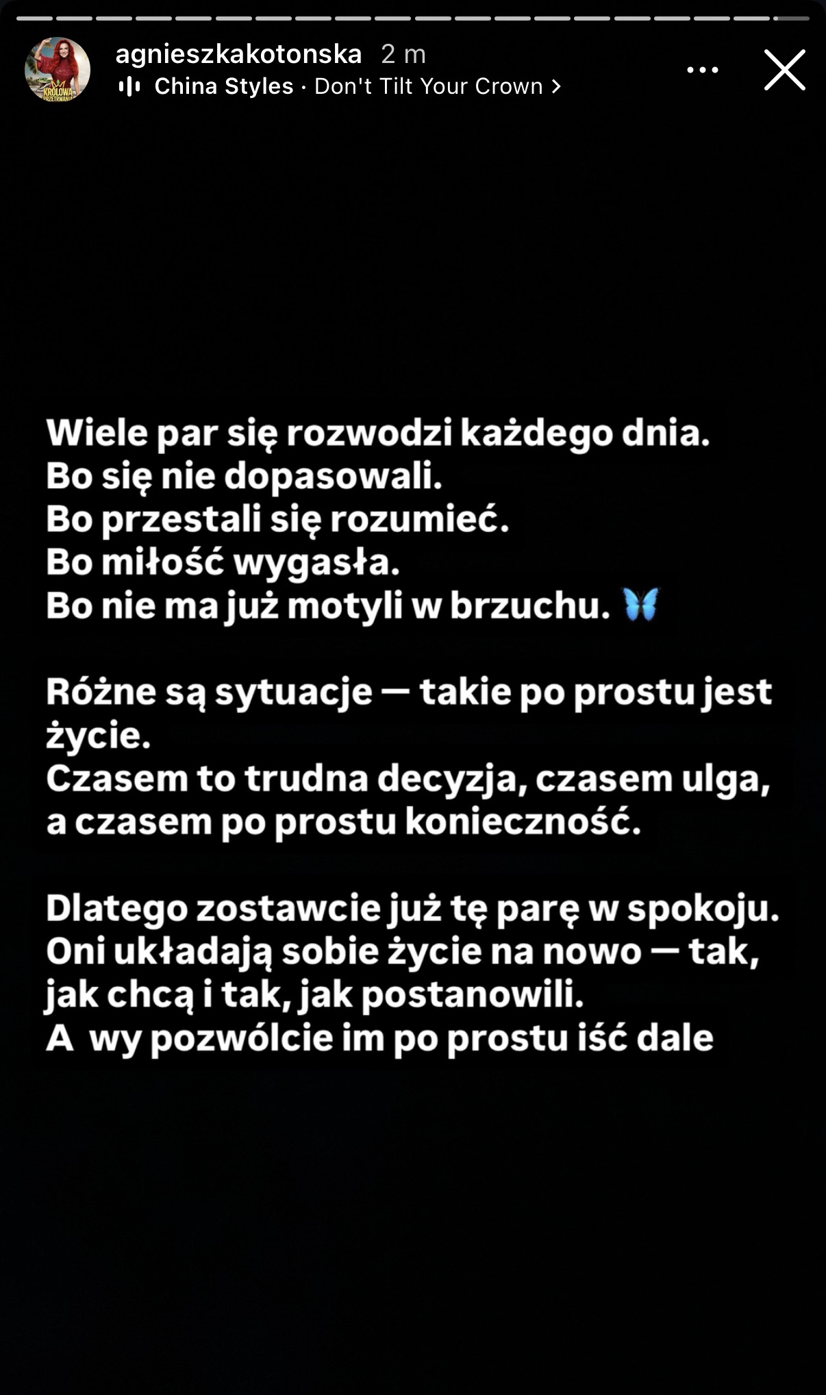 Każdy z nich ma już swoje życie, swoje decyzje, swoje nowe dni. Niech oddychają spokojnie, bez miliona komentarzy pod każdym zdjęciem. Bo to już naprawdę przechodzi ludzkie pojęcie. Dajmy ludziom po prostu żyć. Po swojemu i w swoim tempie – dodała.