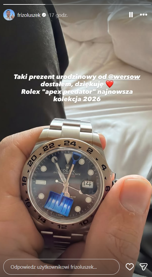 Na zdjęciu opublikowanym na Instagramie widać zegarek marki Rolex – model Explorer II z czarną tarczą. Na oficjalnej stronie jego cena wynosi 45 800 zł. Pod fotografią Karol Wiśniewski napisał: „Taki prezent urodzinowy od Wersow dostałem, dziękuję. Rolex “apex predator” najnowsza kolekcja 2026”.